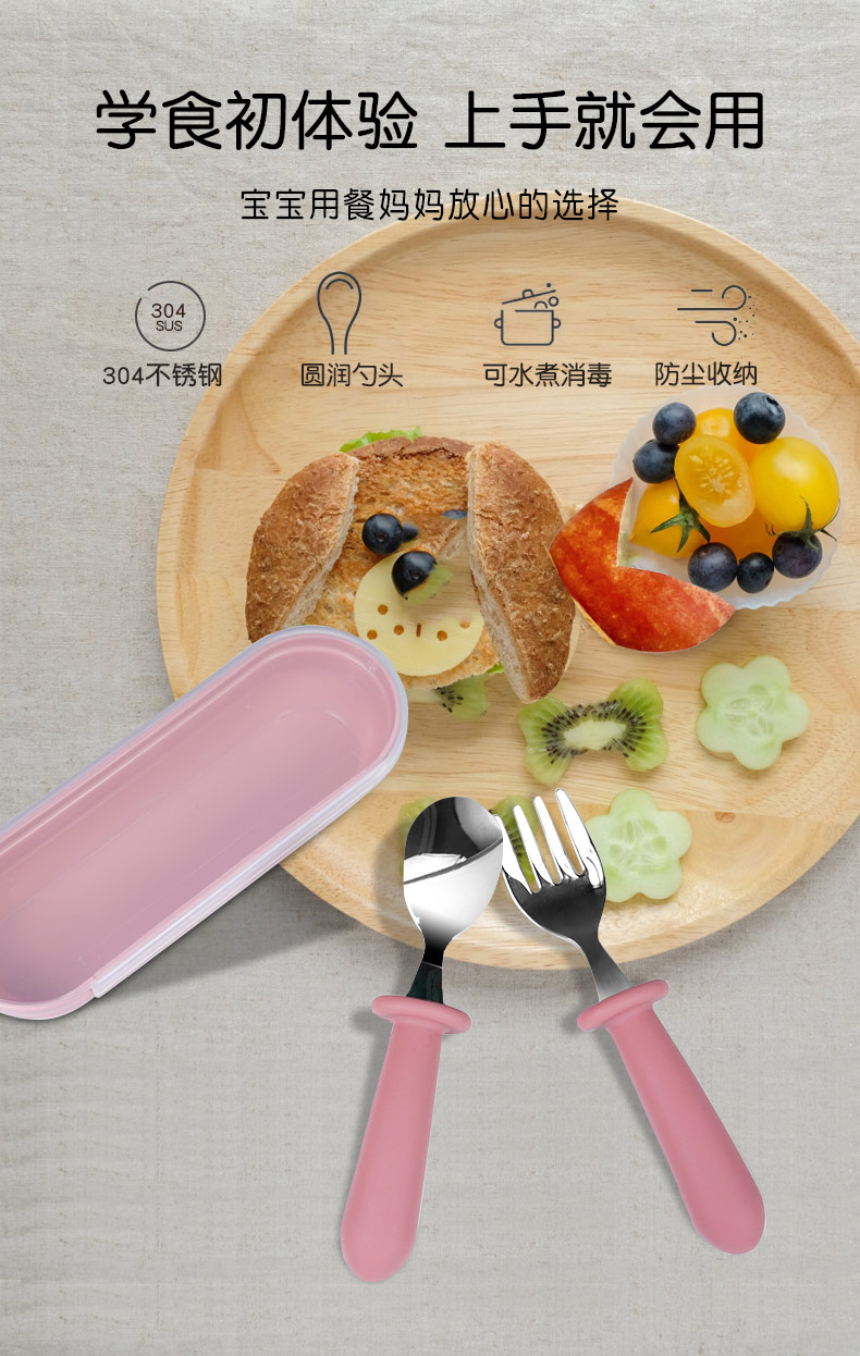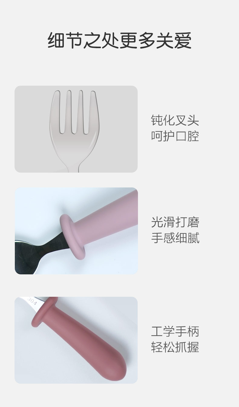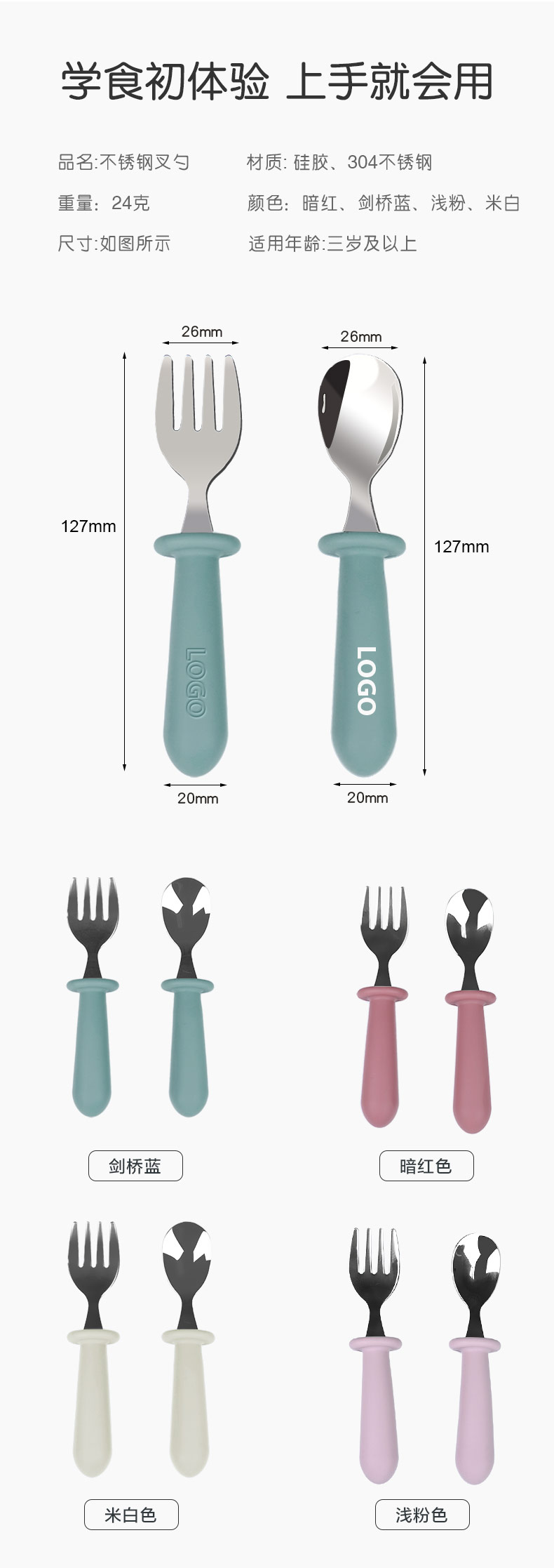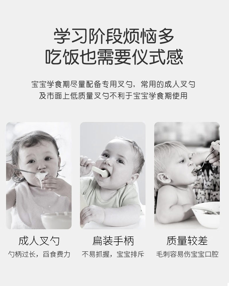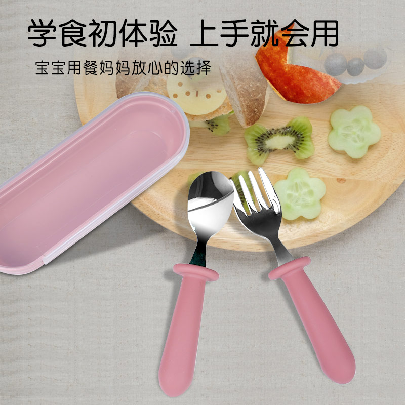 兒童不銹鋼餐勺 硅膠手柄寶寶吃飯短柄叉勺 寶寶叉勺套裝餐具